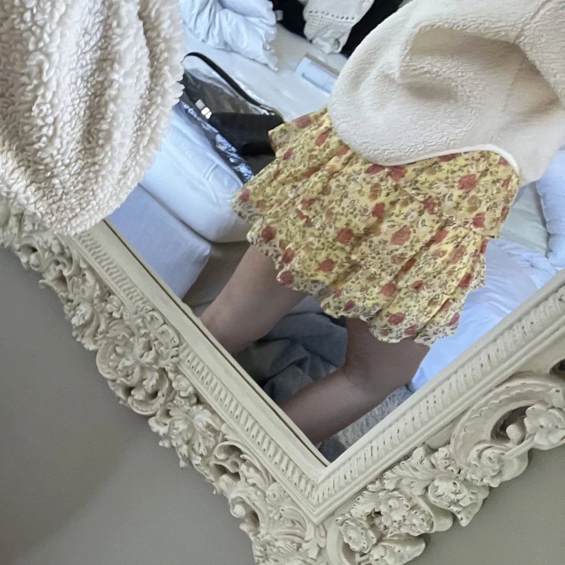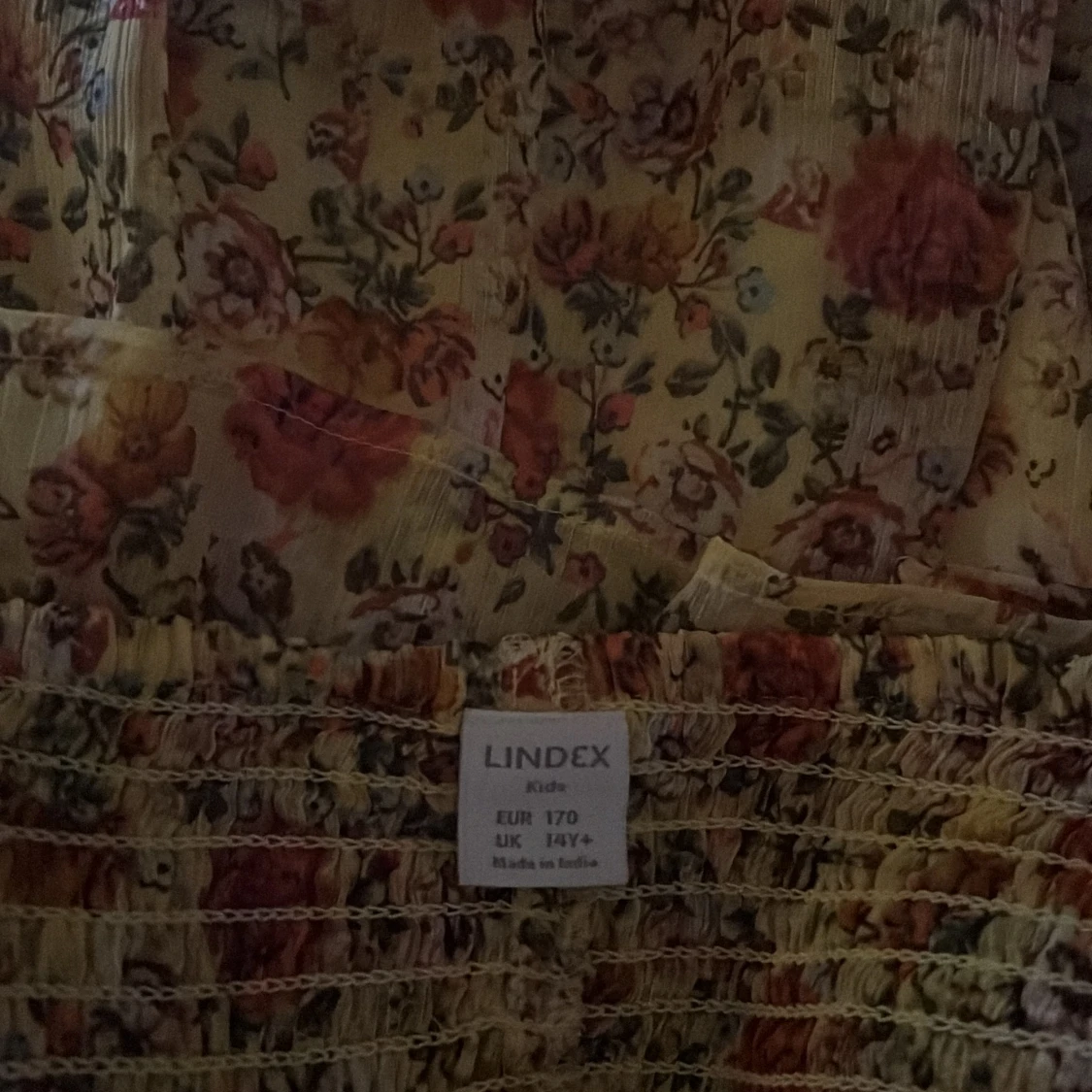 Gul rödblommig tjol❤️ Väldigt fin har använt den mycket men den ser ändå ut som ny💛jag skulle säga att storleken är som en M🌹säljer den super billigt efter som att den är gammal!
