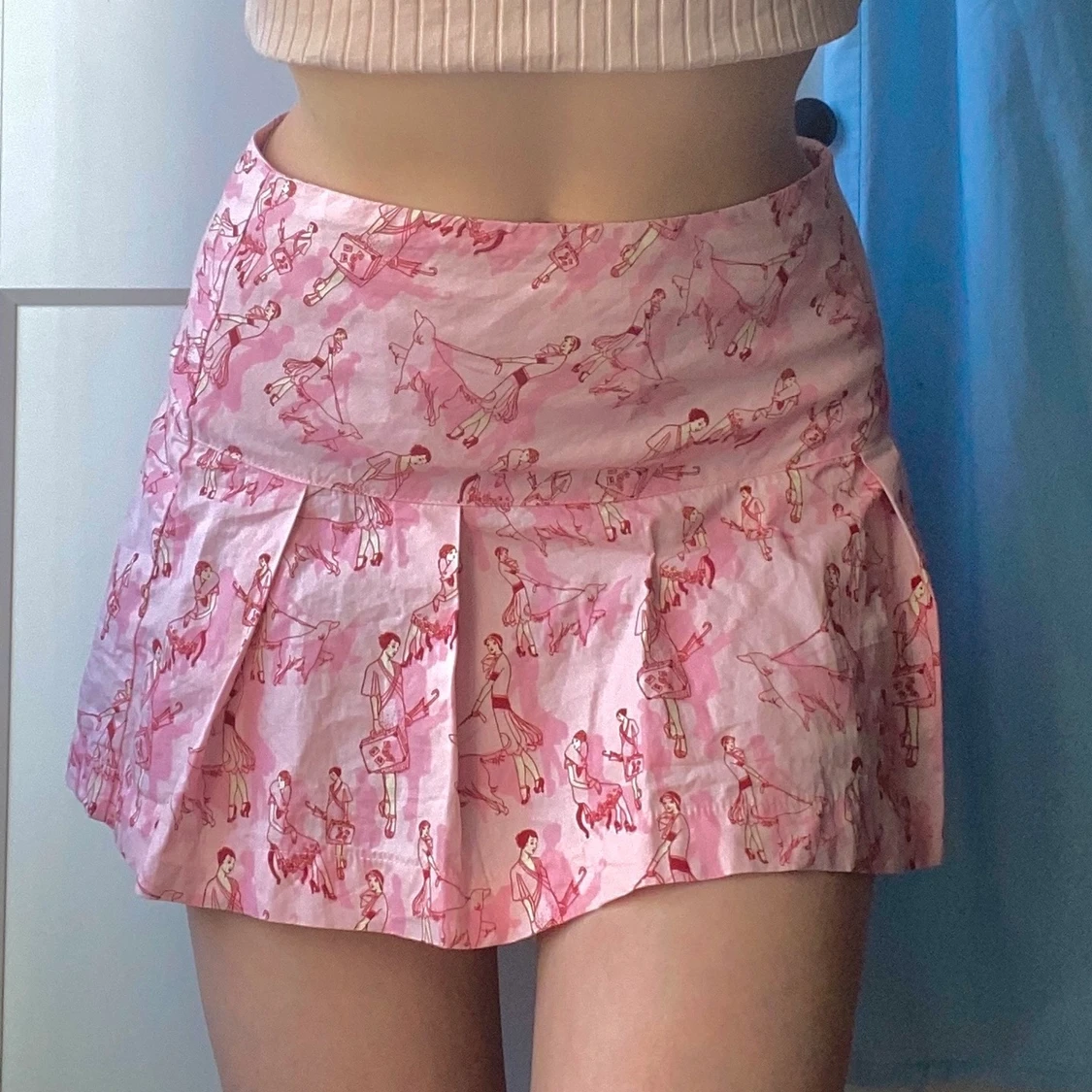 Cool rosa kjol med unikt tryck med fransk vibe. Kan sitta som antingen high waist eller mid waist. Originellt från HM men kan inte längre ens hitta spår av plagget online.