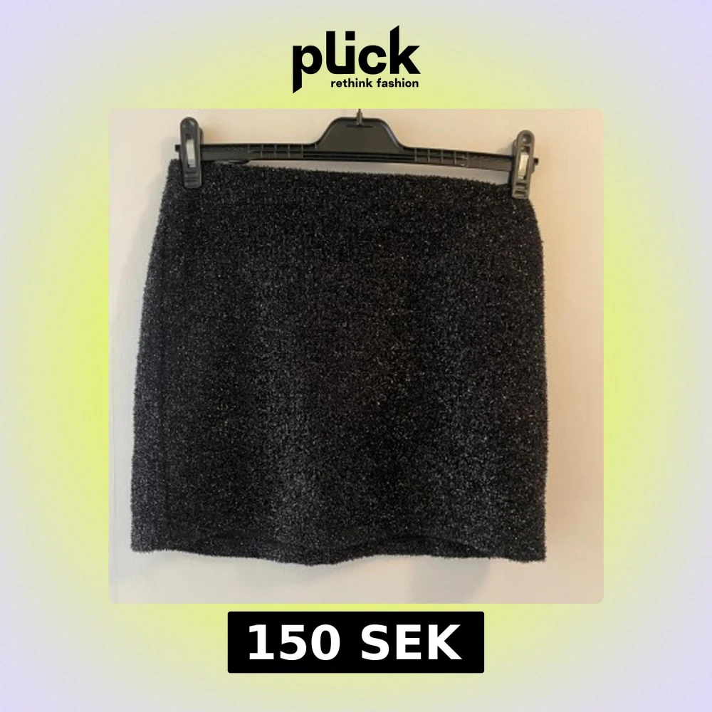 En svart glittrig minikjol från Vila. Den har en underkjol som gör att den inte är genomskinlig samt resår i midjan. Storlek S men på mig som normalt är en M sitter den jättebra!