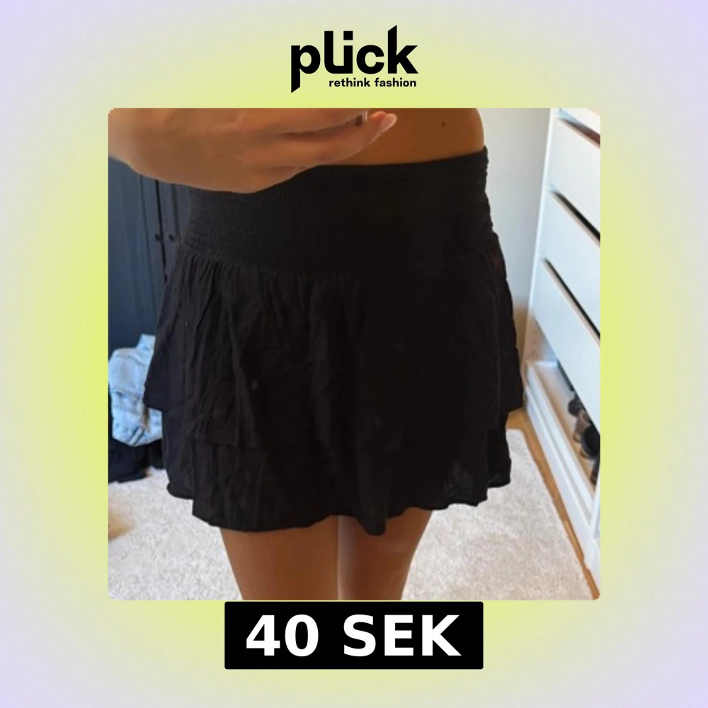 Supersöt svart kortkjol med volanger och bred smockad resår i midjan.