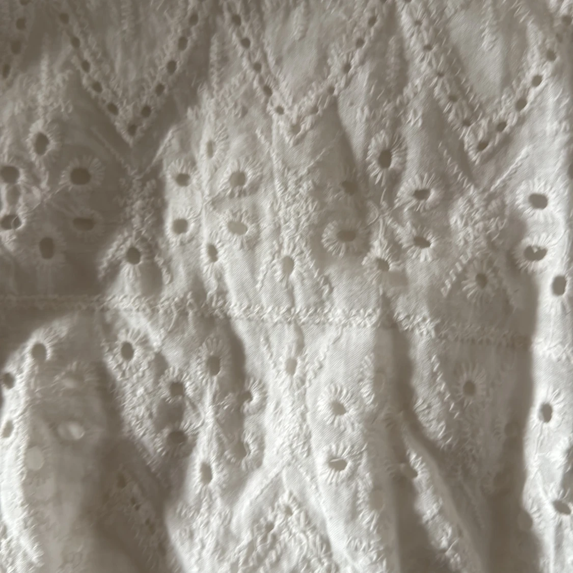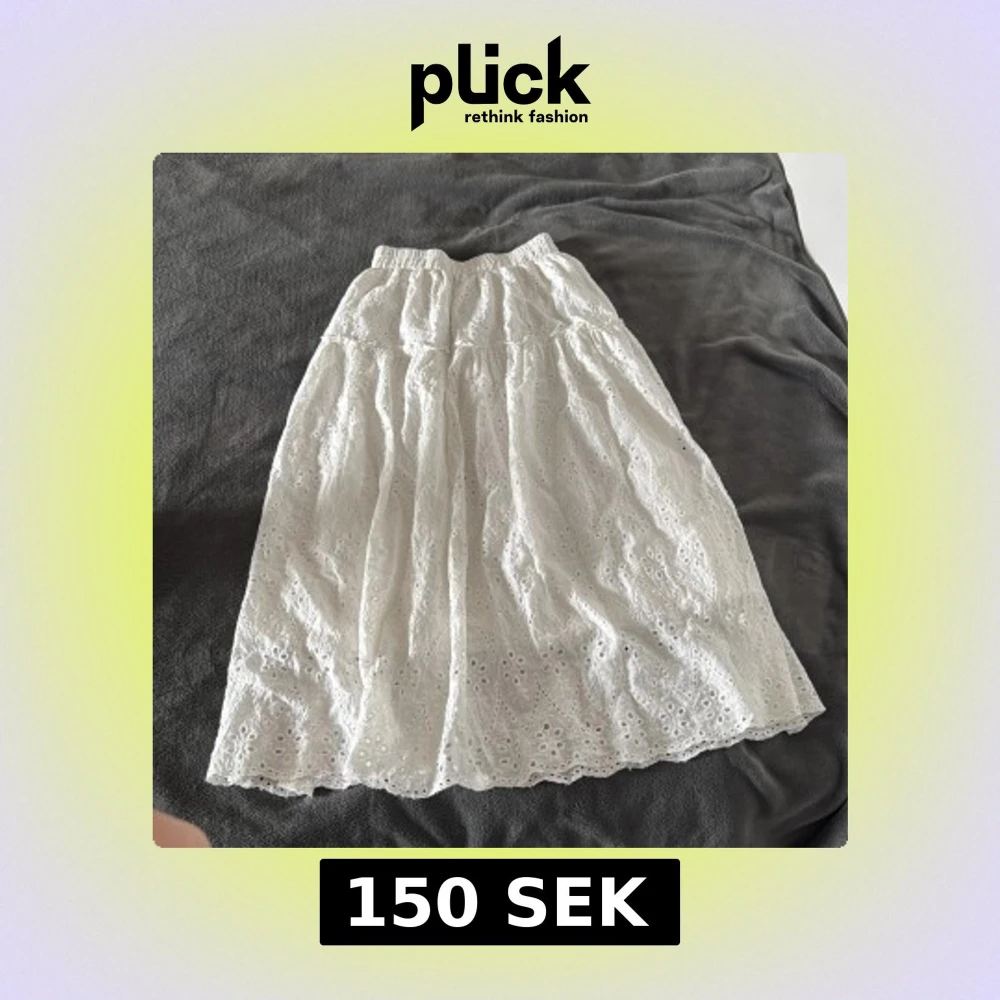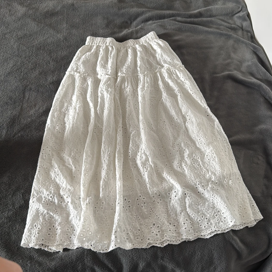 Superfin vit långkjol i bomull med broderade blommor och hålmönster. Köpt i Korea. Kjolen har resår i midjan och ett romantiskt, luftigt fall. Perfekt för dig som gillar en feminin och somrig stil.