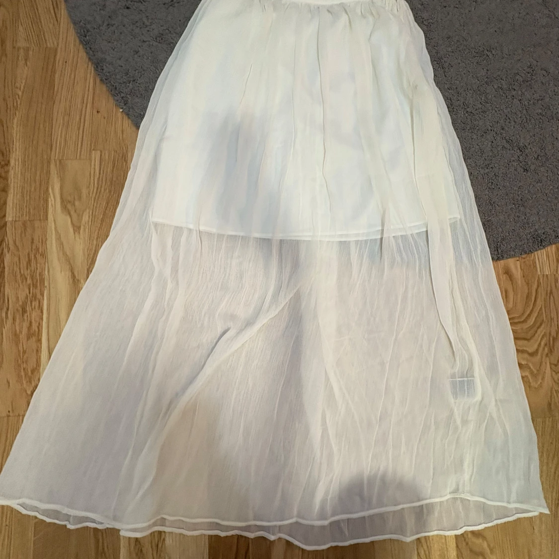 Säljer en vit långkjol med flowig och transparent look. Kjolen har ett tunt, skirt yttertyg och en kortare underkjol som ger en snygg layering-effekt. Perfekt för dig som gillar en luftig och romantisk stil. Storlek EUR 36 💕helt ny med lapp
