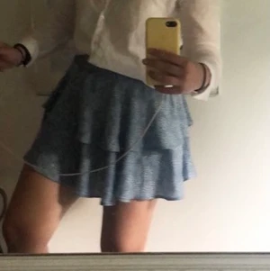 Jättefin volangkjol. Blå med vitt blommönster. Köparen står för frakten.