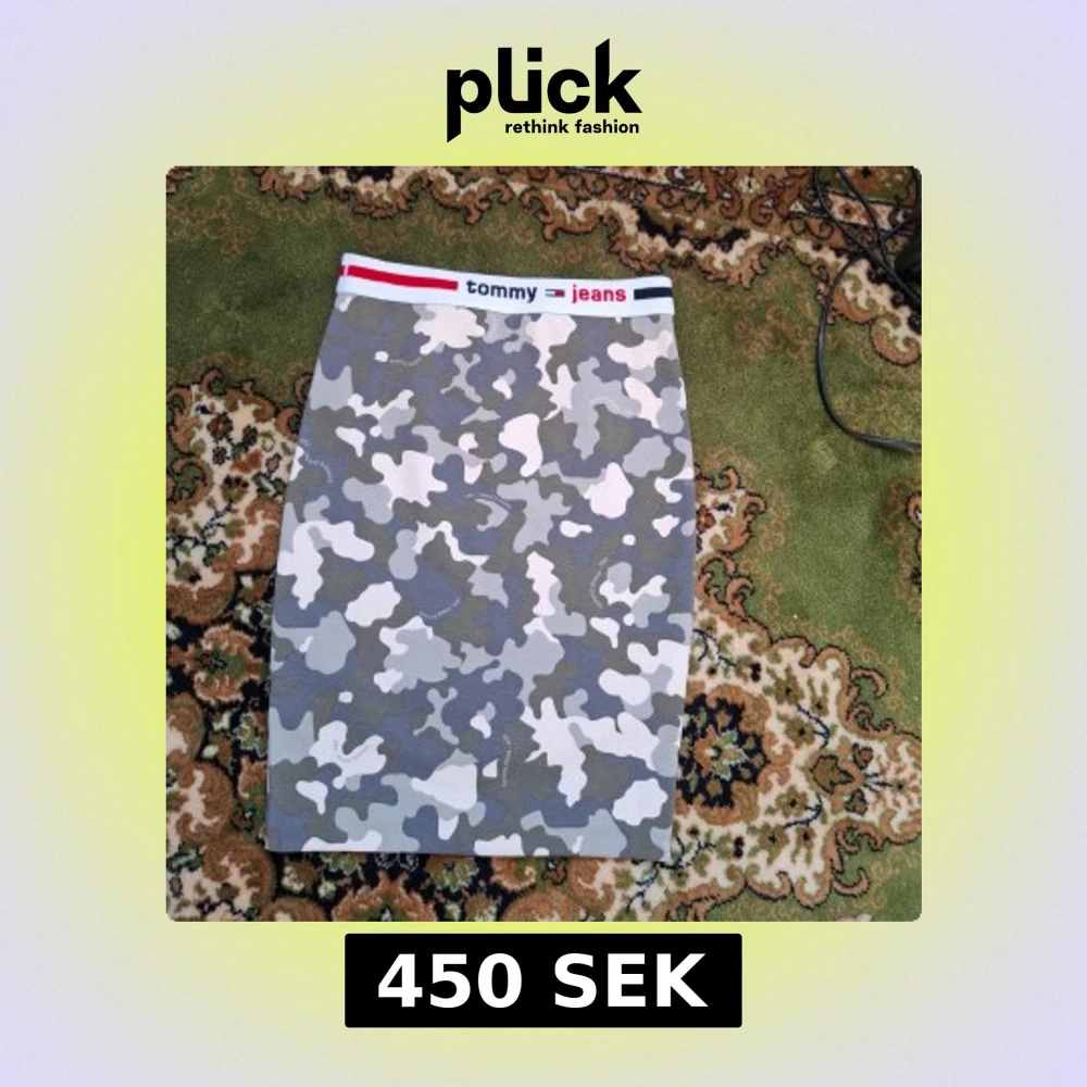 Snygg camo-mönstrad kjol från Tommy Jeans i storlek XS. Kjolen har en elastisk midja med märkets logga i rött och blått. Perfekt för en cool och avslappnad stil.