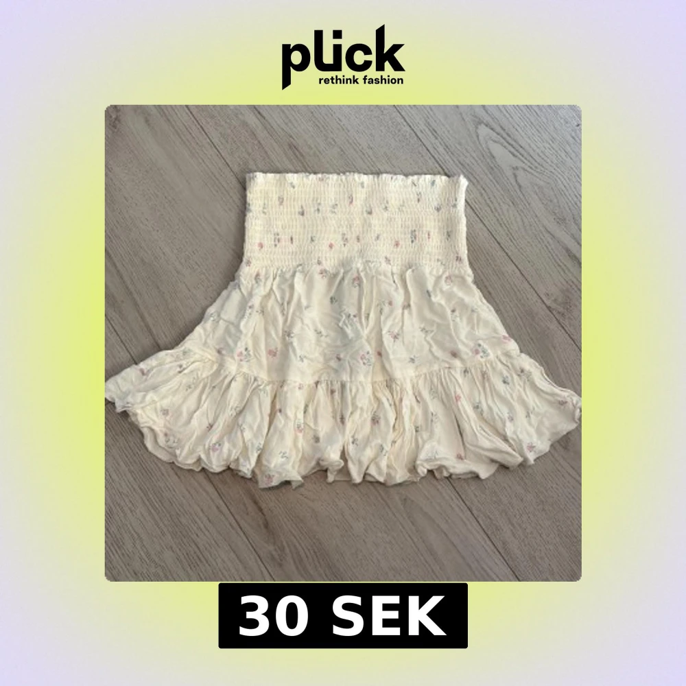 Supersöt kort volangkjol i ljusbeige med små blommor i rosa och blått. Kjolen har smock i midjan och flera lager volanger som ger en flowy känsla. Perfekt för en somrig och romantisk look.