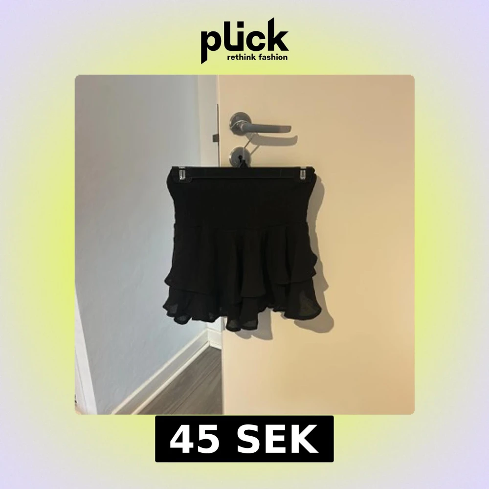 Supersnygg svart kortkjol med volanger och resår i midjan. Kjolen har en luftig och lätt känsla, perfekt för att skapa en cool och trendig look. Passar dig som gillar att sticka ut med stilrena detaljer och voluminös form.