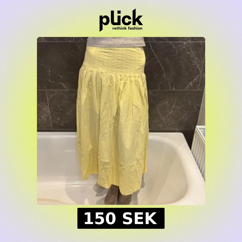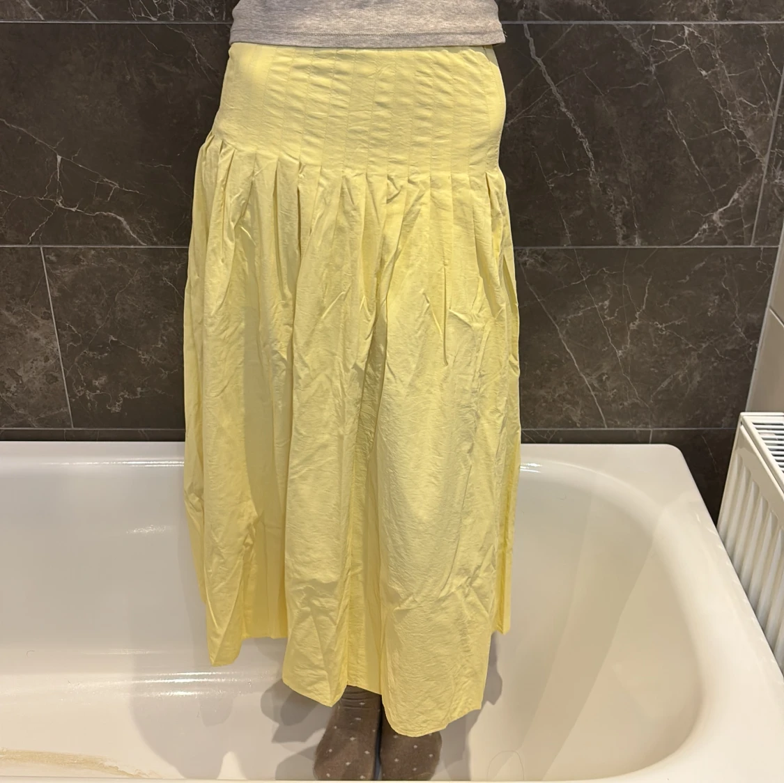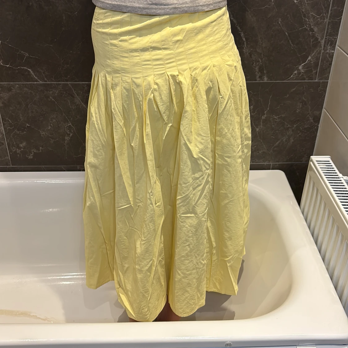 Superfin ljusgul långkjol med volym och lätt rynkade detaljer upptill. Kjolen har en slät midja och är helfärgad utan mönster. Den är fodrad med en kort underkjol för extra komfort. Perfekt för dig som vill ha en flowy och somrig look. 100% polyester.