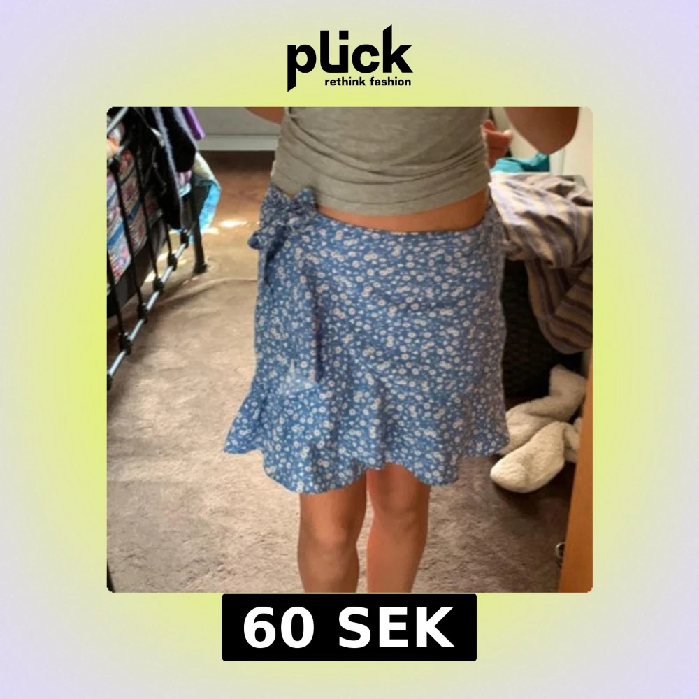 Söt blå omlottkjol med vita blommor och volangdetaljer. Kjolen har en knytning i midjan och är perfekt för varma dagar.