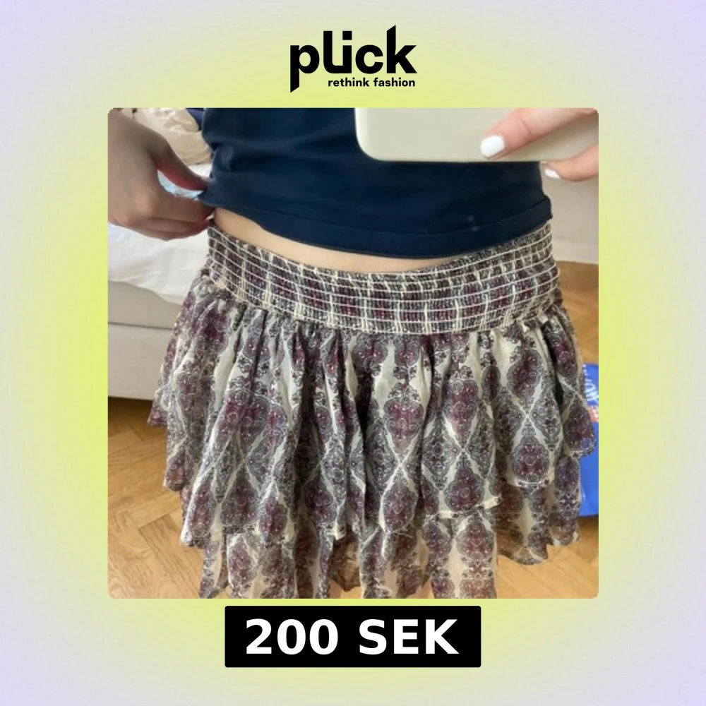 Säljer en kort volangkjol med bred smock i midjan. Kjolen har ett bohemiskt mönster i vinrött, grått och beige och är luftig med flera lager volanger. Perfekt för dig som gillar en avslappnad och trendig stil.