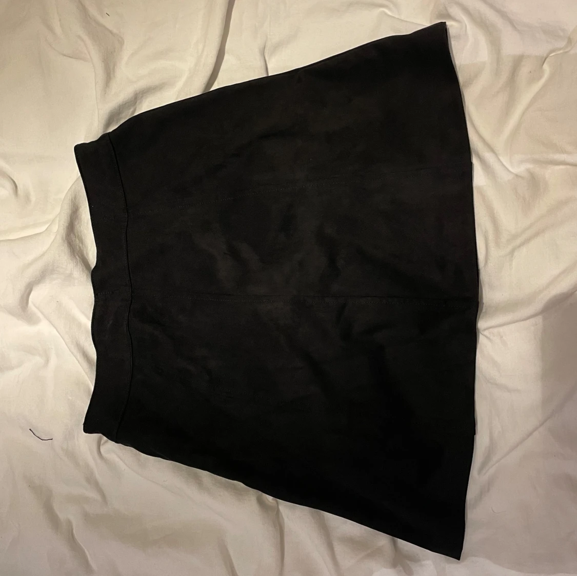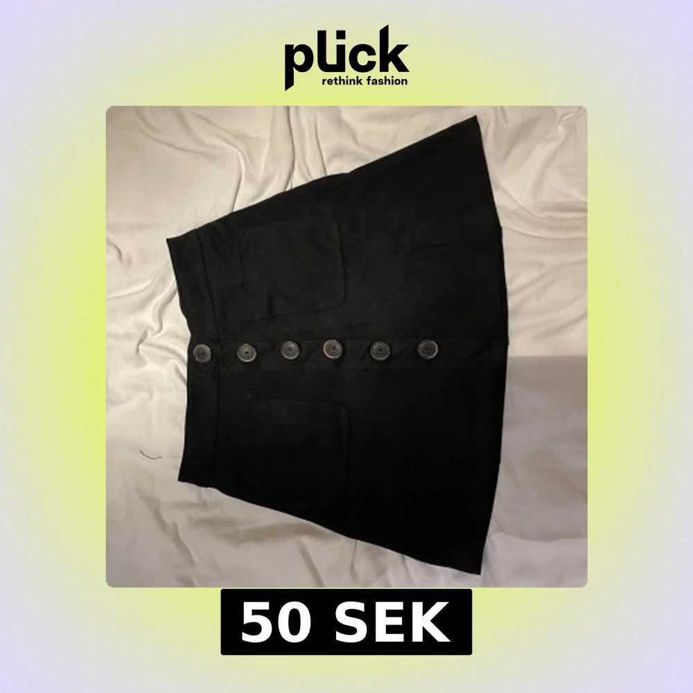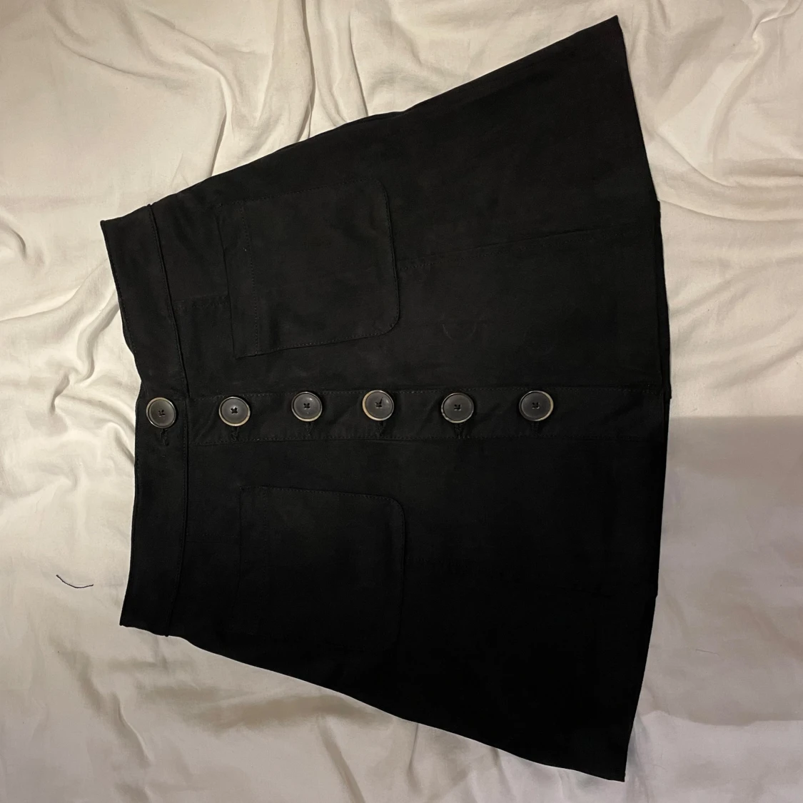 Svart kortkjol i mockaimitation med stora fickor framtill och snygga knappar längs hela framsidan. Kjolen har en lätt A-linjeformad siluett.