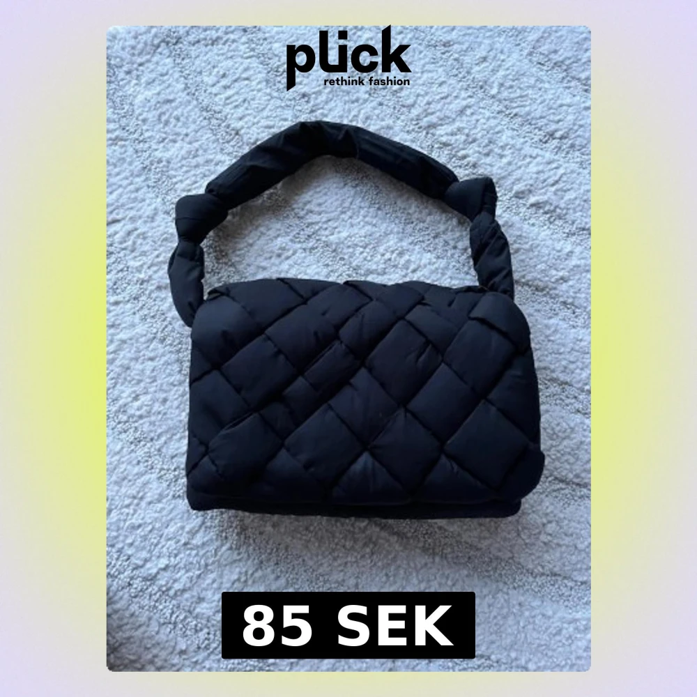 Trendig svart handväska med quiltat mönster och vadderad känsla. Väskan har en unik axelrem med knutdetaljer och är tillverkad i ett mjukt tygmaterial. Perfekt accessoar för att lyfta din outfit.