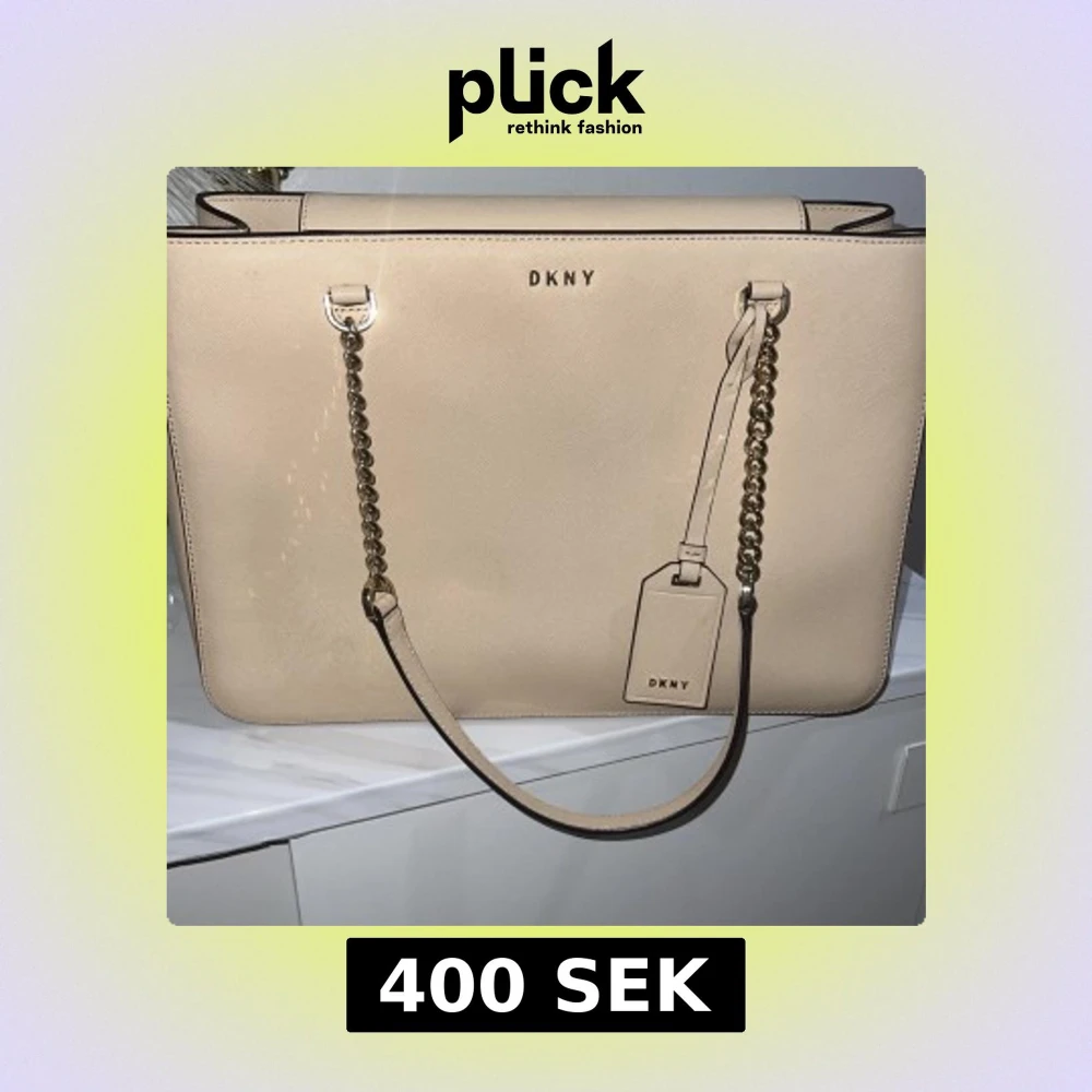 Snygg beige axelväska från DKNY med stilren design och guldfärgade kedjedetaljer på axelremmen. Väskan är i slätt skinn och har en matchande tag med DKNY-logga framtill. Perfekt för dig som gillar klassiska och trendiga accessoarer. Priset kan disskuteras vid snabb affär!