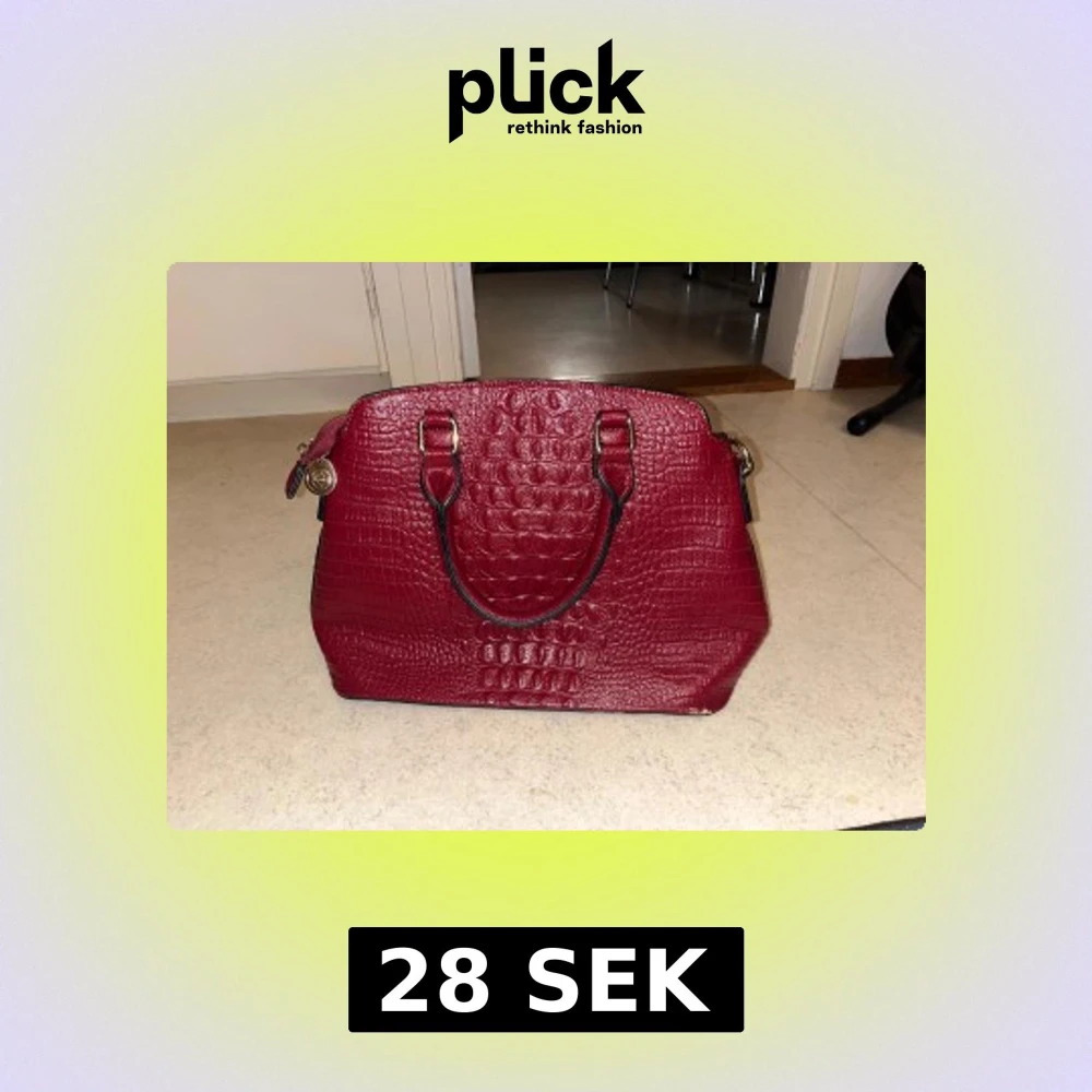 Snygg vinröd handväska i konstläder med krokopräglat mönster och guldfärgade detaljer. Väskan har två handtag och dragkedja upptill samt dekorativt hänge i metall. Perfekt för dig som vill ha en trendig accessoar med lyxig känsla.En liten fläck (se på sista bilden)