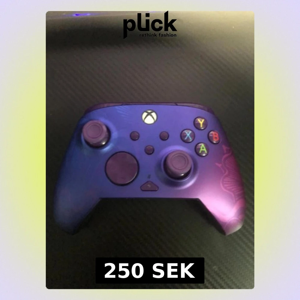 Snygg Turtle Beach handkontroll till Xbox i lila och svart med cool gradient och färgglada knappar. Ergonomisk form med greppvänliga handtag och extra knappar på baksidan. Tillverkad i plast och designad för gaming med stil.
