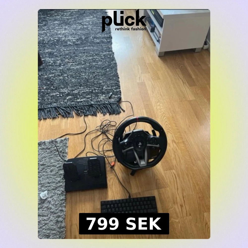 Säljer ett svart racing rattset från Hori med tillhörande pedaler, perfekt för bilspel på PS4 eller PC. Ratten har flera knappar och en röd detalj upptill, och pedalerna är i plast med halkskydd. Allt kopplas in med sladdar för stabil anslutning.