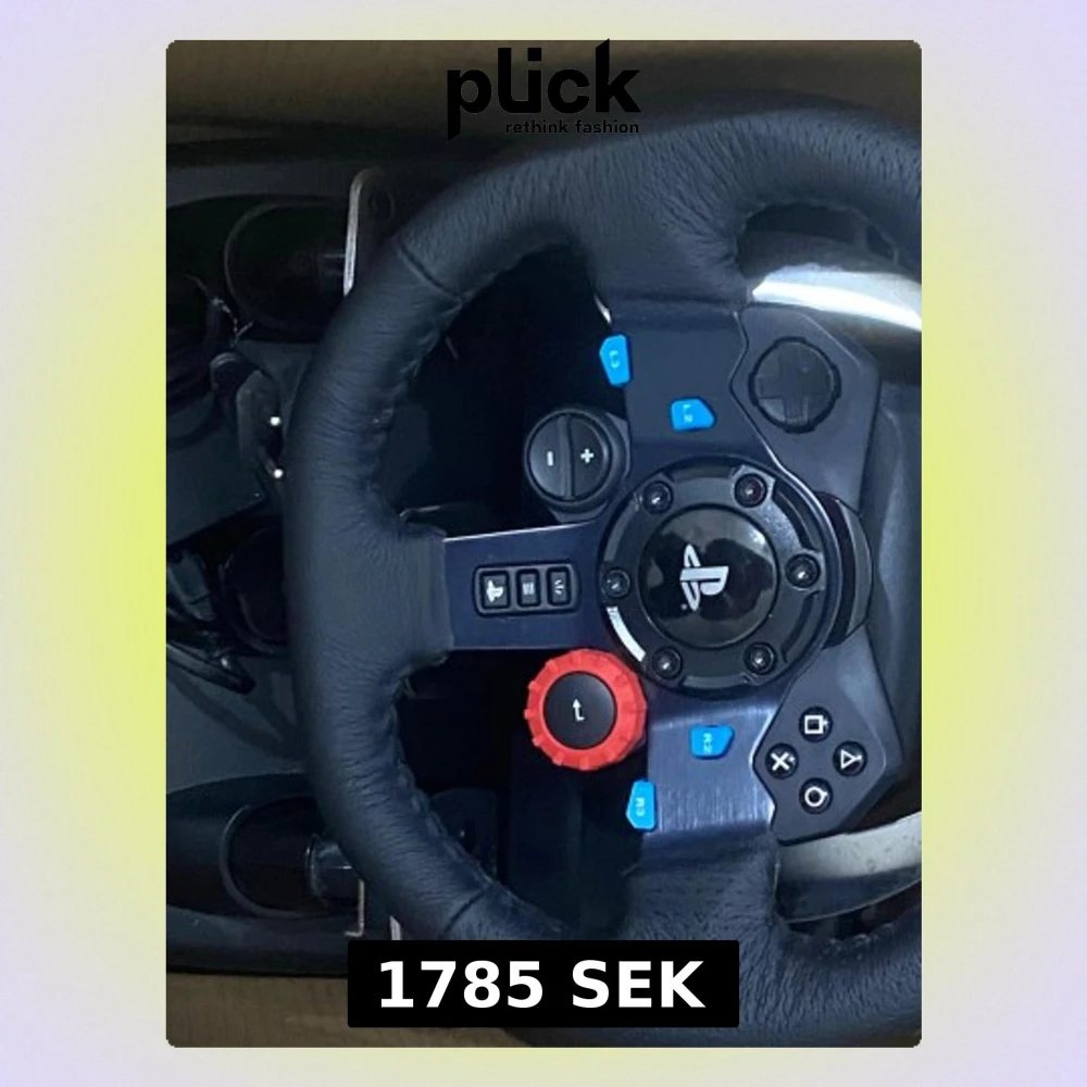 Säljer en Logitech G29 racerratt med pedaler för PlayStation 4 och 5. Ratten har svart läderklädsel, blå och röda detaljer samt flera knappar för spelkontroll. Perfekt för racing och simracing med realistisk känsla och slitstarka material.