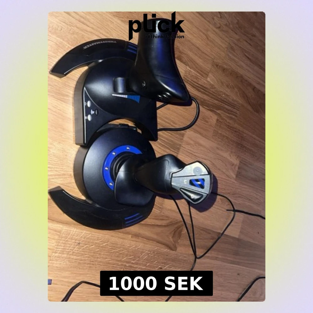 Säljer en Thrustmaster joystick och throttle för PC/PS, perfekt för flygsimulatorer och rymdspel. Setet är svart med blå detaljer och har flera knappar och reglage för realistisk spelkänsla. Ansluts med USB-kabel. Tillverkad i plast. Har använt den max 4 gånger den är helt ny sick