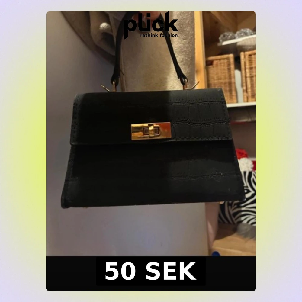 Stilren svart handväska med krokodilpräglat mönster och guldfärgat vridlås. Väskan har ett klassiskt handtag och en elegant, fyrkantig form. Perfekt accessoar för att lyfta din outfit.