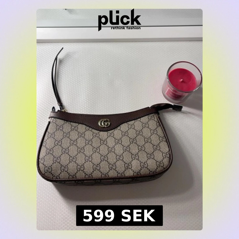 Snygg beige handväska med klassiskt GG-monogram i canvas och mörkbruna läderdetaljer. Väskan har en elegant guldtonad logga framtill och smal axelrem i läder. Perfekt för dig som gillar lyxiga accessoarer och tidlös design.
