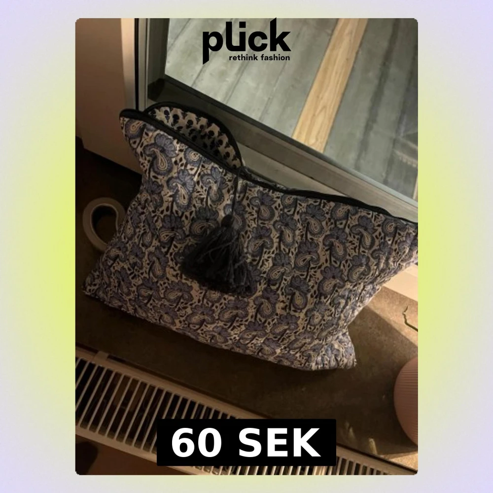 Snygg handväska men framförallt necessär i blått och vitt med paisleymönster och dekorativ tofs. Den har dragkedja och ett unikt mönstrat innerfoder i blått den ger lite Greklands vibe. Tillverkad i mjukt tygmaterial.