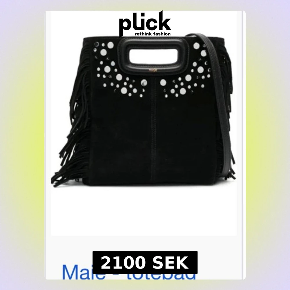 Snygg svart handväska i mocka från Maje med dekorativa silverfärgade nitar upptill och fransar längs sidorna. Väskan har ett fyrkantigt handtag och en avtagbar axelrem för olika stilar. Perfekt accessoar för en trendig look. Man får med både påse och band. Väskan ligger på 2100kr då jag köpte den för mindre än ett år sedan för 4000kr.