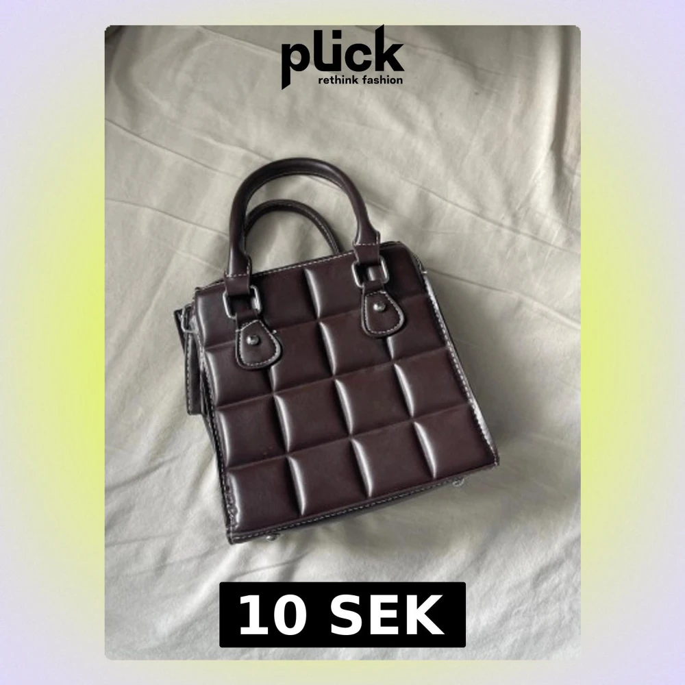Snygg mörkbrun handväska i quiltad design med rutmönster. Väskan har både handtag och justerbar axelrem, samt vita kontrastsömmar längs kanterna.