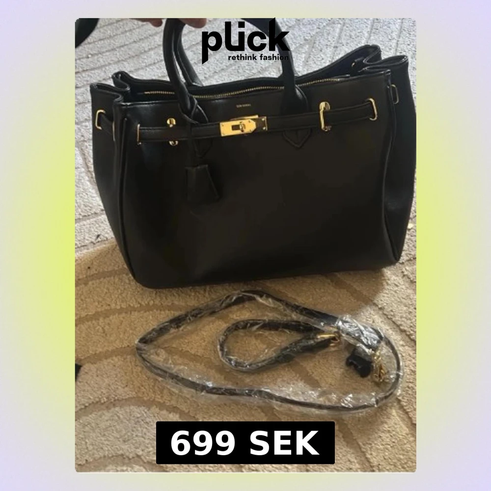 Säljer åt en kompis😊Stilren svart handväska från Don Donna i läderimitation med guldfärgade metalldetaljer och lås framtill. Väskan har dubbla handtag och medföljande axelrem som kan fästas. Perfekt för dig som gillar klassisk och elegant design. Köpt ca 1500kr💕 Liknar H väskan, detta är nya modellen