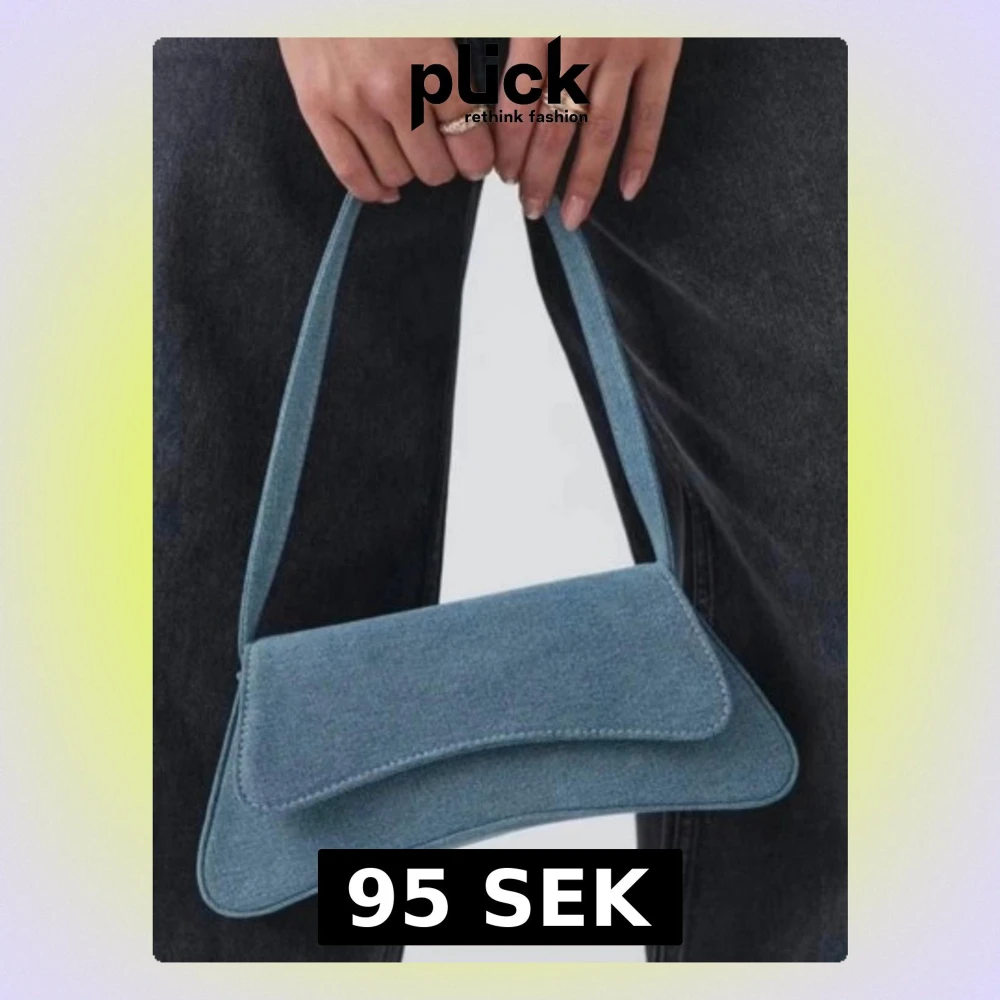 Trendig handväska i ljusblå denim från Gina Tricot. Väskan har en avlång, mjukt trekantig form med lock och magnetknäppning. Ett axelband gör den enkel att bära och insidan har en liten ficka. Perfekt accessoar för en cool och avslappnad look.