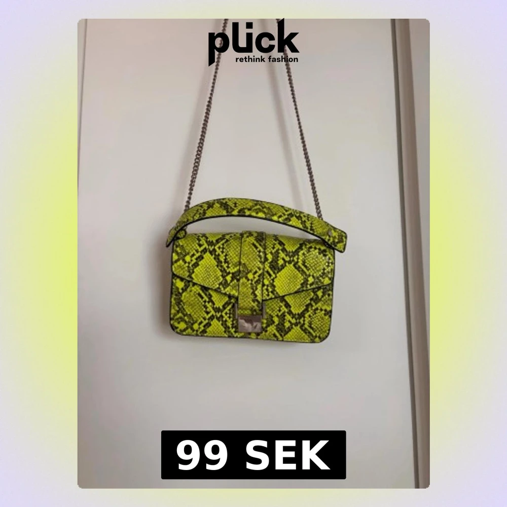 Snygg grön handväska i konstläder med ormmönster och silverfärgad kedjerem. Väskan har ett lock med metallspänne och ett praktiskt topphandtag. Perfekt statement piece för dig som vill sticka ut med din stil.