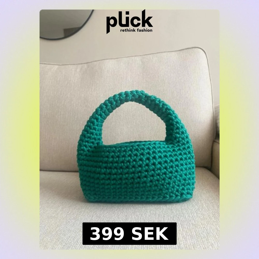 Cool handväska i grönt, virkat material med rundad form och breda handtag. Perfekt för dig som vill sticka ut med en unik accessoar. Väskan är handgjord och har en chunky look som känns trendig och modern.