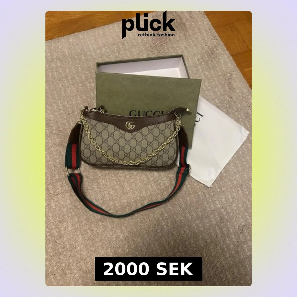Snygg handväska från Gucci i GG Supreme-mönster med bruna läderdetaljer, guldfärgad kedja och bred axelrem i grönt och rött. Väskan har dragkedja upptill och klassisk logga framtill. Perfekt för dig som vill ha en ikonisk och trendig accessoar.