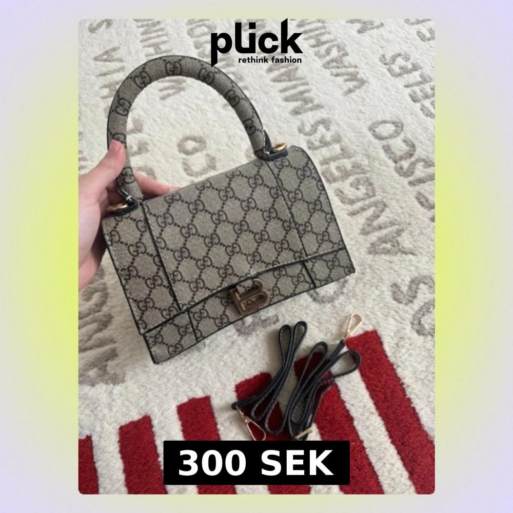 Snygg beige handväska från Gucci med klassiskt GG-monogram över hela väskan. Väskan har ett topphandtag, guldfärgade detaljer och medföljande axelremmar i matchande material. Tillverkad i canvas med läderdetaljer och elegant metallspänne framtill.