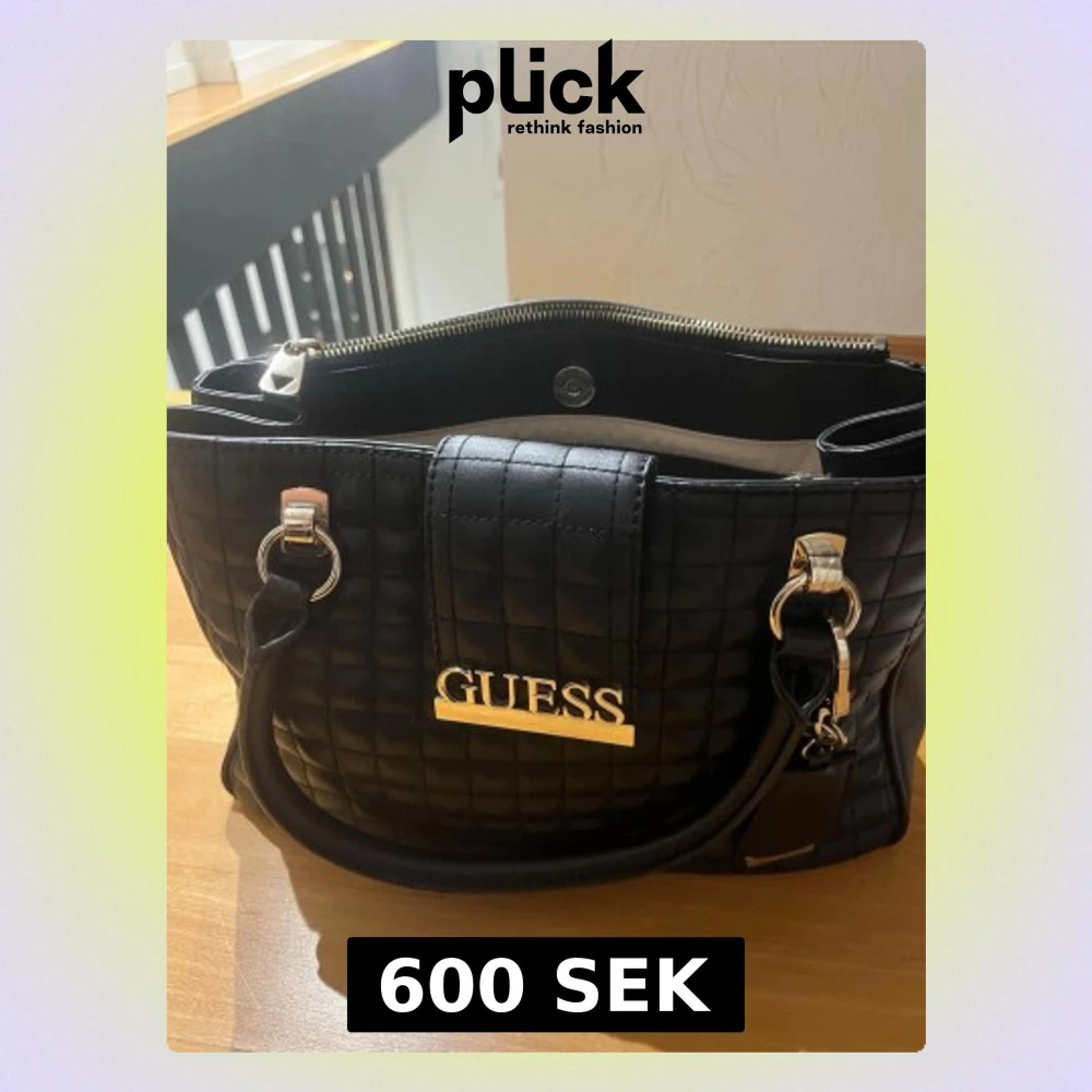 Snygg svart handväska från Guess med quiltat mönster och silvriga metalldetaljer. Väskan har dubbla handtag, dragkedja upptill och en tydlig Guess-logga framtill. Perfekt för dig som vill ha en stilren och trendig accessoar. Äkta