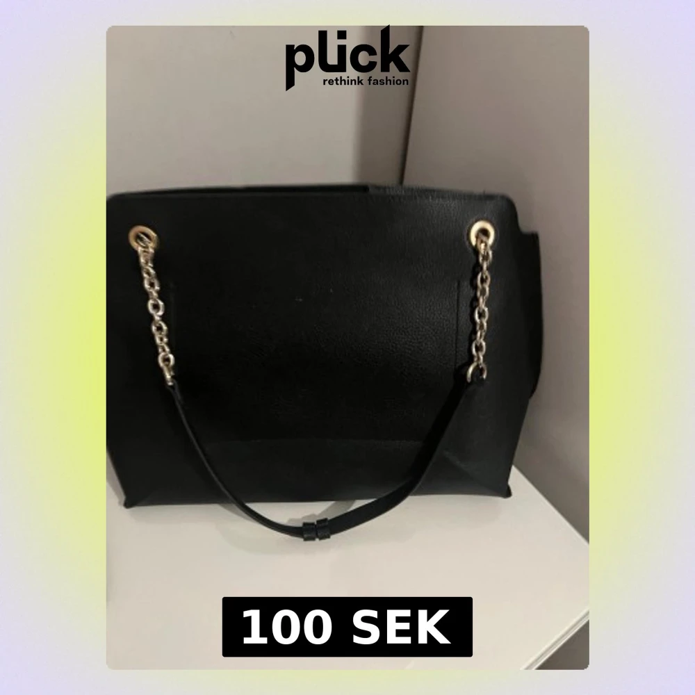 Stilren svart handväska i konstläder med guldfärgade kedjedetaljer på axelremmarna. Väskan har en enkel, rektangulär form och passar perfekt för dig som gillar en klassisk look med en twist. Rymmer allt du behöver till vardagen och har snygga metallringar som detaljer.