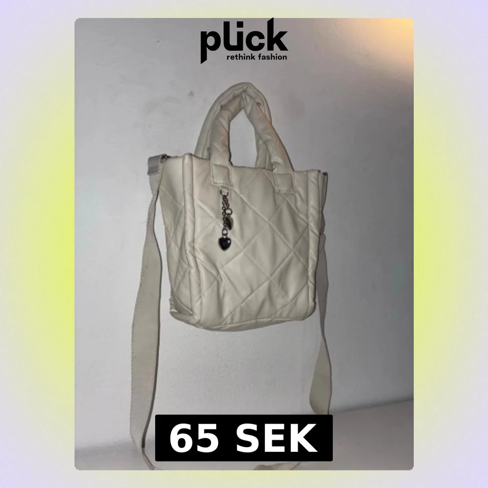 Säljer en vit quiltad handväska från H&M i mjukt material med både handtag och justerbar axelrem. Väskan har ett dekorativt silverfärgat hänge med hjärta och pärlor. Perfekt för dig som gillar trendiga accessoarer och vill ha plats för det viktigaste.