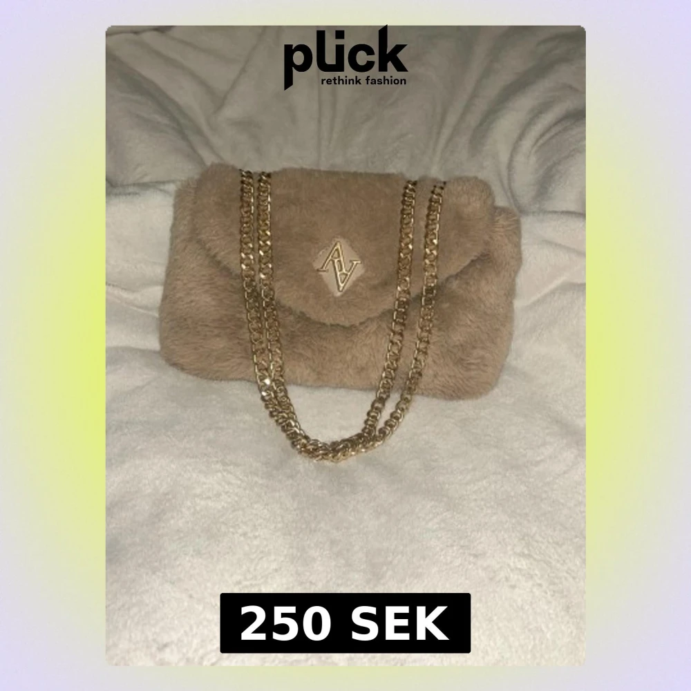 Supersnygg beige handväska i fluffigt material. Väskan har en guldfärgad kedjerem och ett elegant AA-emblem på framsidan. Perfekt accessoar för dig som vill sticka ut med en trendig och mjuk look.