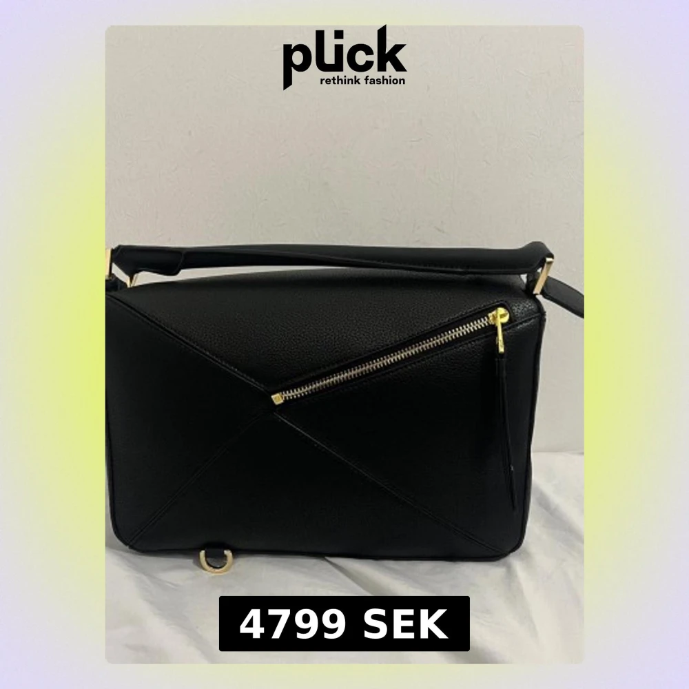Säljer en svart Loewe Puzzle Bag i läder med geometrisk design och guldfärgade metalldetaljer. Väskan har ett snedställt blixtlås framtill och präglad Loewe-logga i hörnet. Perfekt axelrem för att bära crossbody eller på axeln.