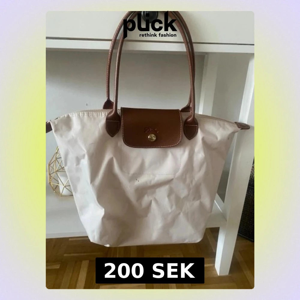 Säljer en ljusrosa/Beige Longchamp handväska med bruna läderhandtag och lock. Väskan har klassisk tote-modell med dragkedja och tryckknapp. Tillverkad i slitstark nylon med detaljer i läder. Perfekt för dig som gillar stilren och tidlös design.