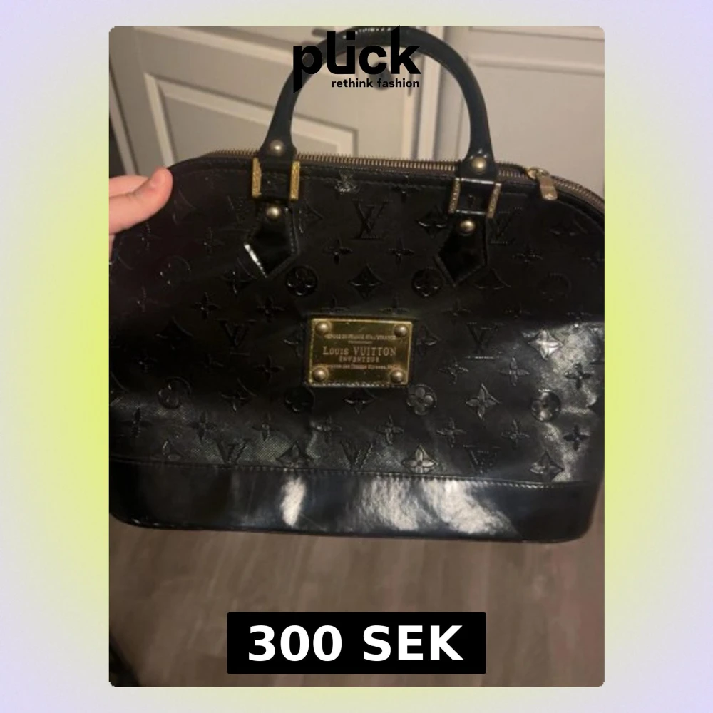 Snygg svart handväska från Louis Vuitton äkta!!! i glansigt läder med klassiskt monogrammönster och guldfärgade metalldetaljer. Väskan har två handtag och en metallskylt framtill med märkets logga. Perfekt för dig som vill ha en lyxig accessoar.ser bra ut på utsidan men ser använd ut på insidan