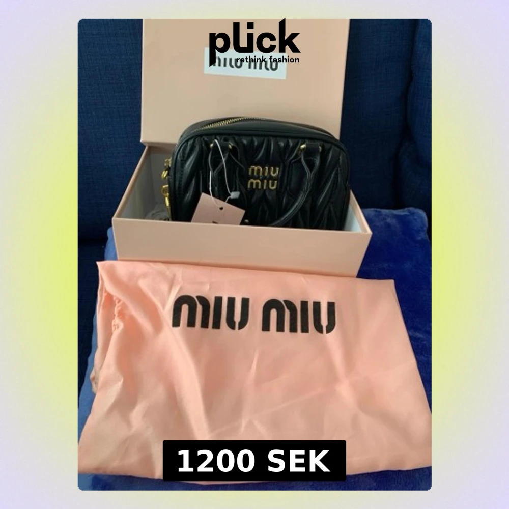Säljer en svart handväska från Miu Miu i mjukt, quiltat läder med guldfärgade detaljer och logga framtill. Väskan har dubbla handtag, dragkedja upptill och medföljer dustbag och box. Perfekt för dig som vill ha en lyxig accessoar med trendig känsla. Väskan är helt oanvänd.