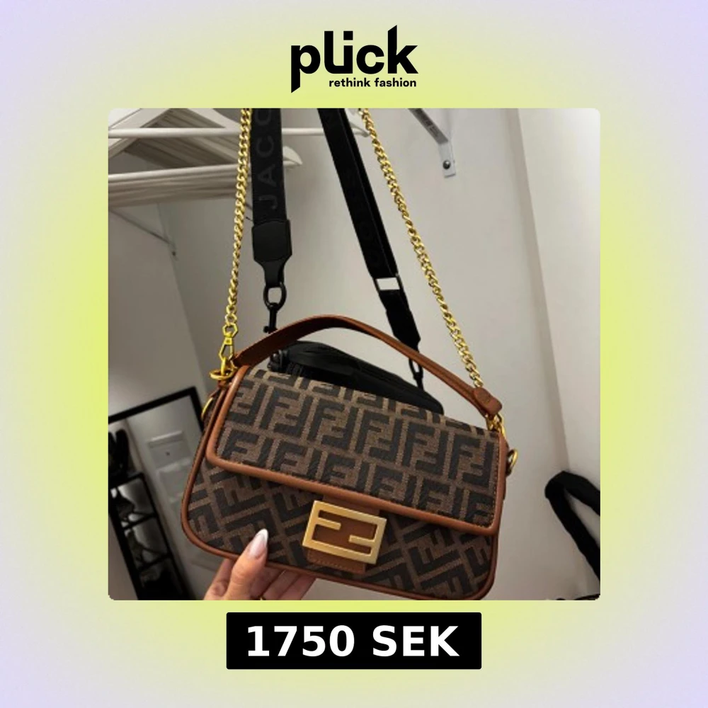 Säljer en brun handväska med klassiskt FF-monogram i mörkbrunt och svart. Väskan har guldfärgade detaljer, kedjerem och en stor Fendi-logga på framsidan. Kan bäras både i handtaget och med axelrem. Materialet är canvas med läderdetaljer. Aldrig använd