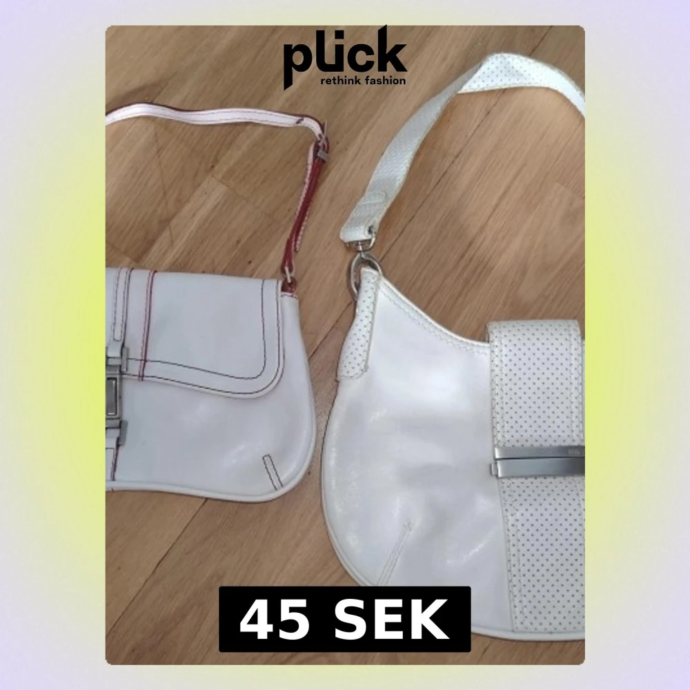 Två vita handväskor från Mango. Den ena väskan har röda sömmar och en röd rem sat röda detaljer, den andra har perforerade detaljer på remmen och framsidan. Båda väskorna har metallspännen med MNG-logotypen. Den större väskan har ett grått innerfoder med flera fack, medan den mindre väskan har ett rött innerfoder med ett fack. Den vita är något mer använd och ha fler defekter/skavanker (se bilder). Den lilla vit/röda väskan har knappt någon defekt, syns bara en mindre dov märke på framsidan som