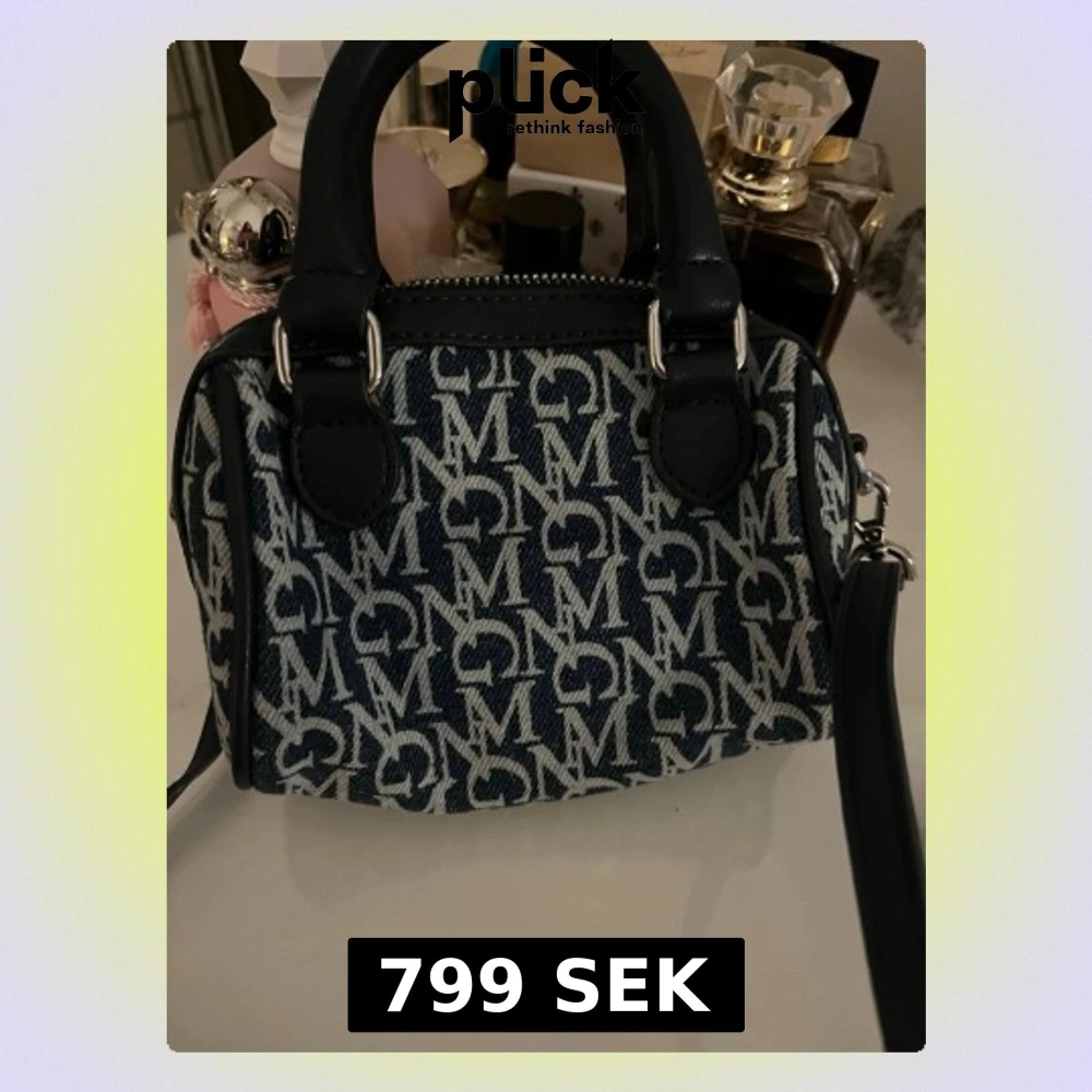 Säljer en liten handväska från Mango i blått denimtyg med vitt logomönster över hela väskan. Väskan har svarta handtag och detaljer i läder samt en avtagbar axelrem.