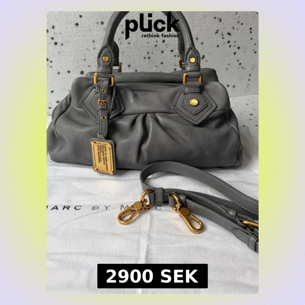 Snygg grå handväska i mjukt läder från Marc by Marc Jacobs. Väskan har guldfärgade metalldetaljer, dubbla handtag och avtagbar axelrem. Dekorativ metallbricka framtill och fina sömmar ger en exklusiv känsla. Perfekt för dig som gillar stilrena accessoarer.