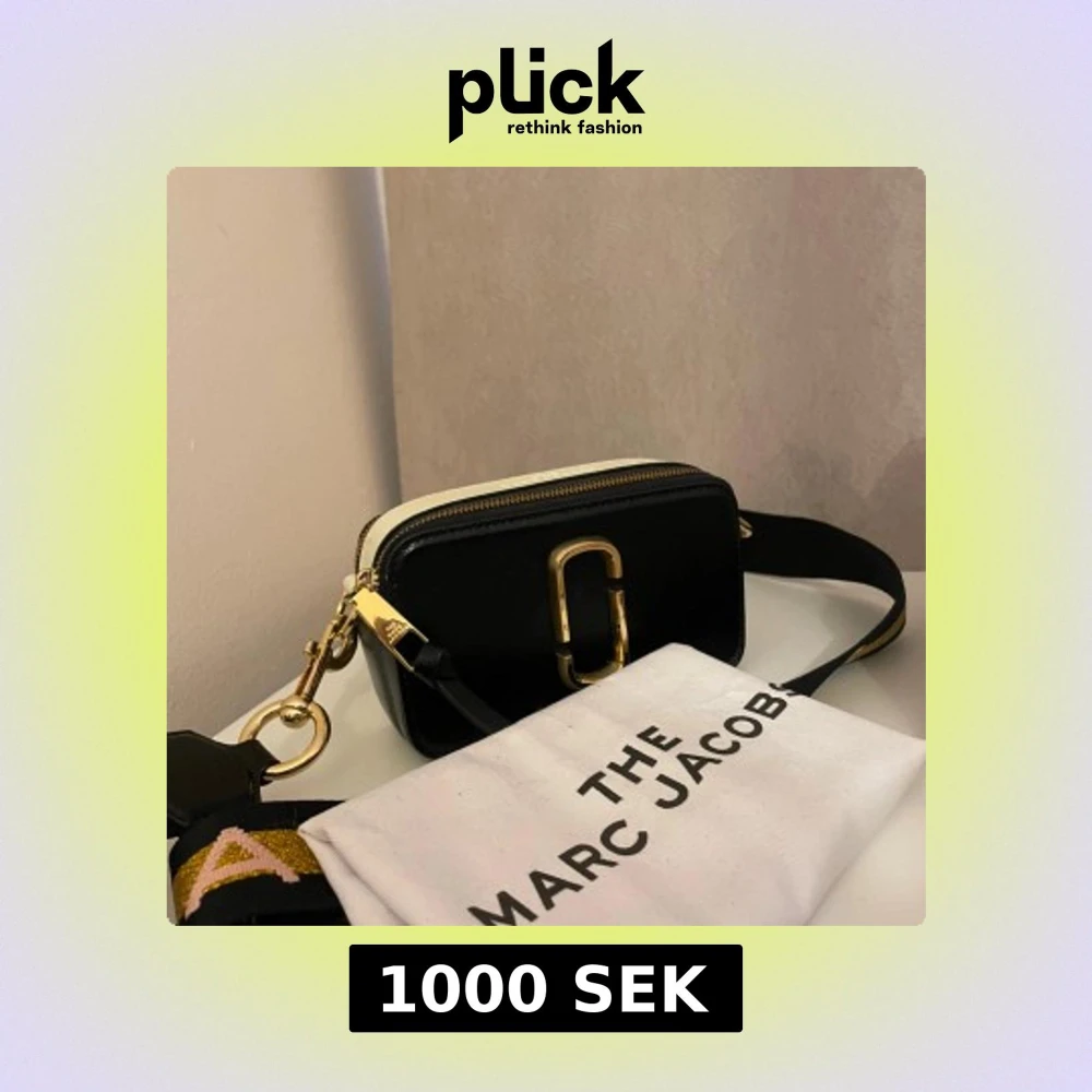 Handväska från Marc Jacobs i modellen Snapshot. Väskan är svart med vita detaljer och har guldfärgade metalldetaljer. Axelremmen är bred och dekorerad med mönster i svart, rosa och gult. Lite små defekter såsom repor, men inget särskilt. Säljer då den inte kommer till användning.