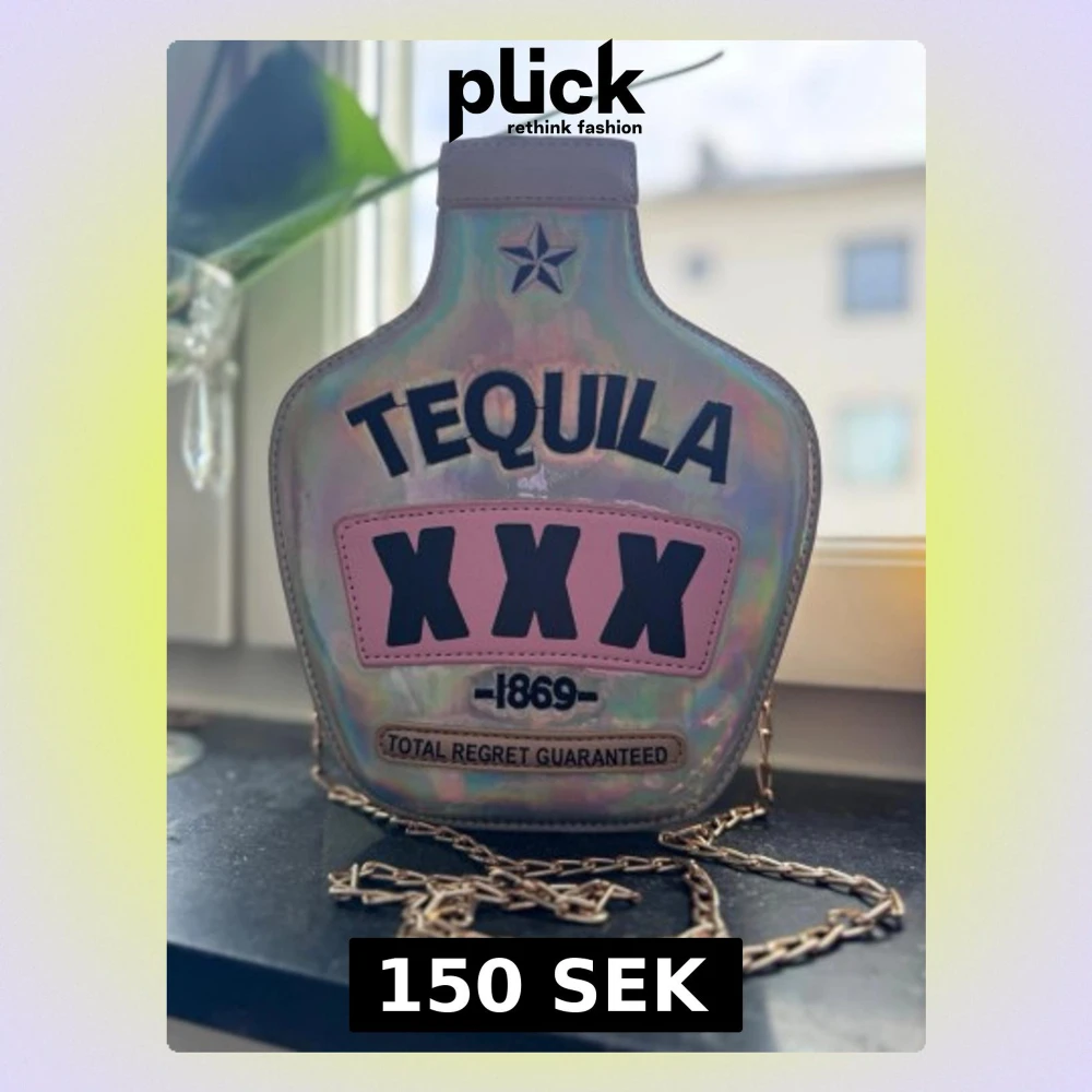 Unik handväska i form av en tequila-flaska med holografiskt material och kedjerem. Väskan har texten 'TEQUILA XXX' och 'TOTAL REGRET GUARANTEED' på framsidan samt rosa och svarta detaljer. Perfekt statement piece för dig som gillar att sticka ut.