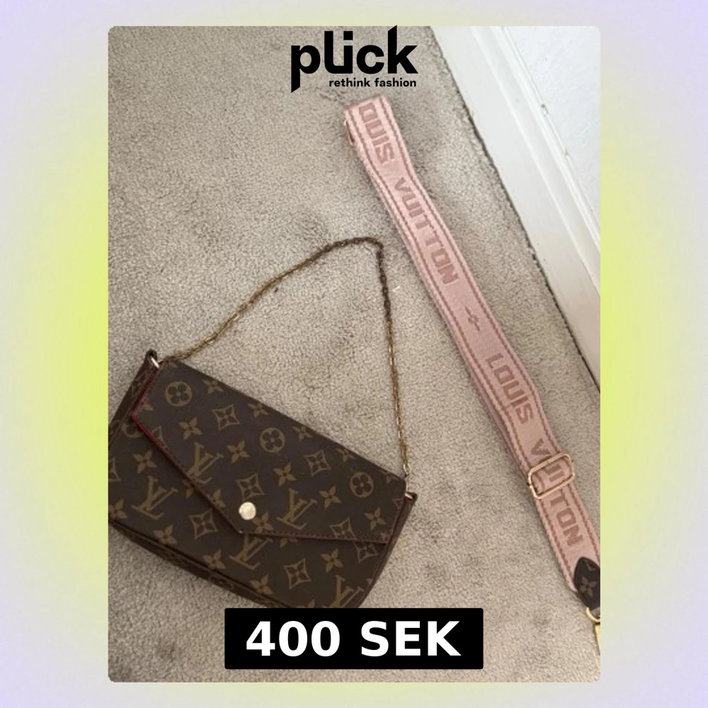 Säljer en brun handväska med klassiskt monogrammönster och guldfärgad kedja. Väskan har en avtagbar bred axelrem i rosa. Perfekt för dig som gillar lyxiga accessoarer och vill sticka ut. Något missfärgad kedja men går att byta ut bandet till det rosa.