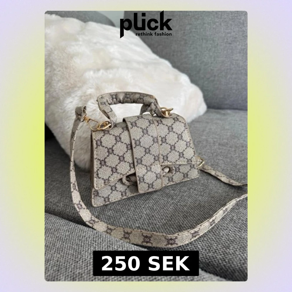 Snygg beige handväska med klassiskt GG-monogram i mörkbrunt. Väskan har både handtag och axelrem i samma mönstrade material samt guldfärgade metalldetaljer. Stängs med magnetlås och har svart innerfoder. Perfekt för dig som gillar lyxig och trendig design.