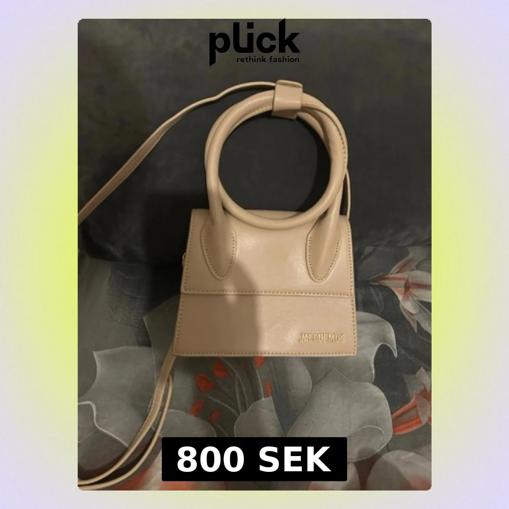 Säljer en beige Jacquemus Le Chiquito handväska i slätt läder med rundade handtag och axelrem. Väskan har en stilren, boxig form och diskret Jacquemus-logga i guld på framsidan. Perfekt för dig som gillar trendiga accessoarer.