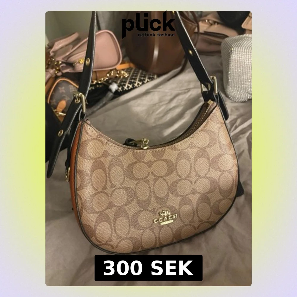 Snygg handväska från Coach i beige med klassiskt monogrammönster och guldfärgad logga framtill. Väskan har svarta justerbara axelremmar och bruna detaljer på sidorna. Tillverkad i tåligt canvasmaterial med dragkedja upptill. Dragkedjan är lite sönder